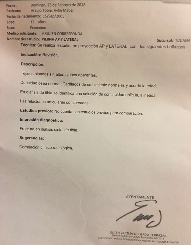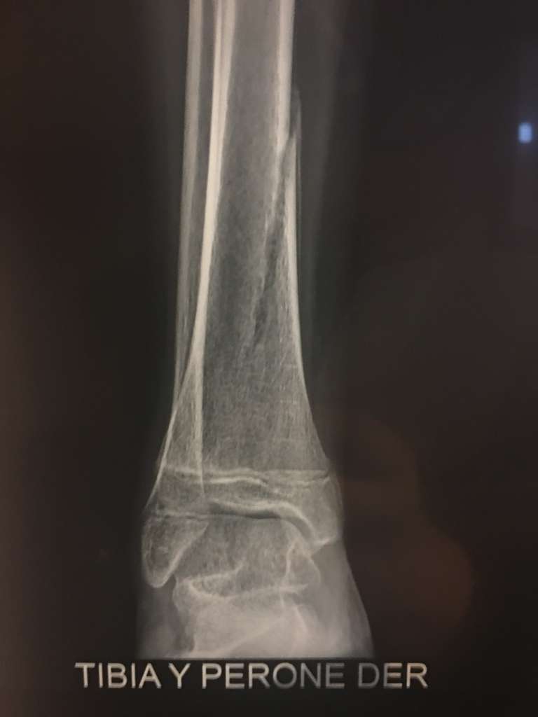 - In the tibial diaphysis, an oblique, aligned disruption of bone continuity is identified.